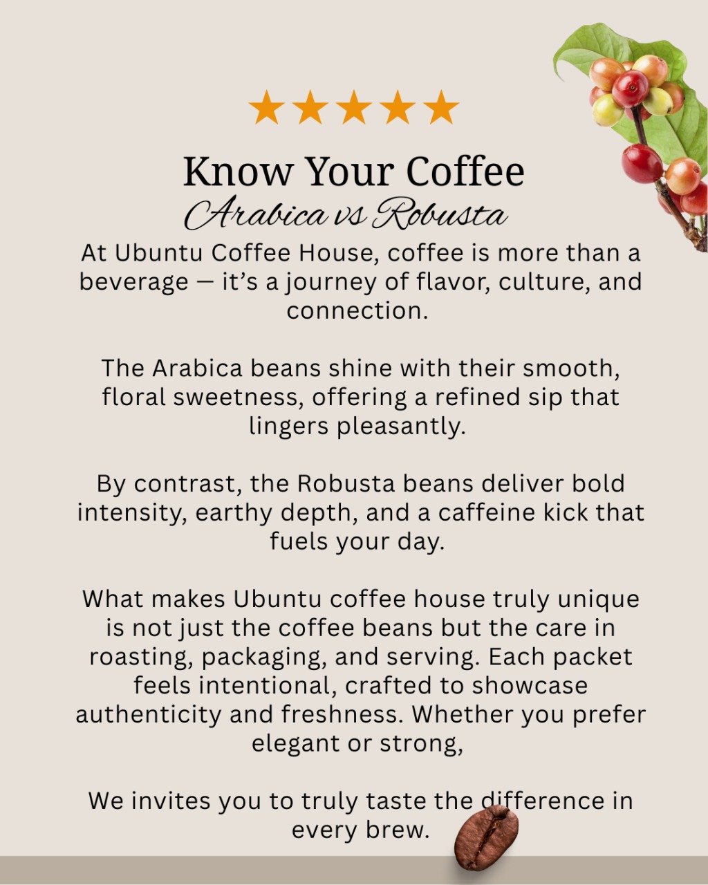 Ubuntu Coffee House, powered by Ubuntu Coffee LLC, celebrates Africa’s coffee heritage by sourcing premium beans from the farmers. Committed to fair trade, sustainability, and community empowerment, the initiative embodies the spirit of "Ubuntu"—"I am because we are." Every cup reflects a dedication to quality, resilience, and global impact.